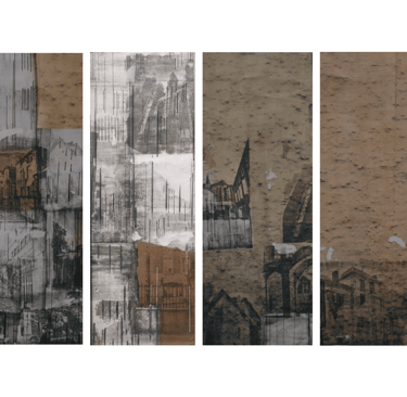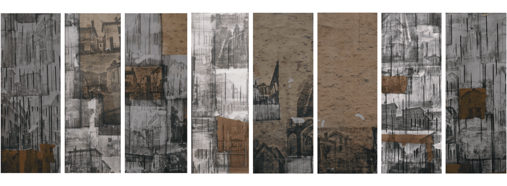 Rues | 2023 | Photo transfer, ink, graphite and collage on paper | 4.5 x 12 inches, each