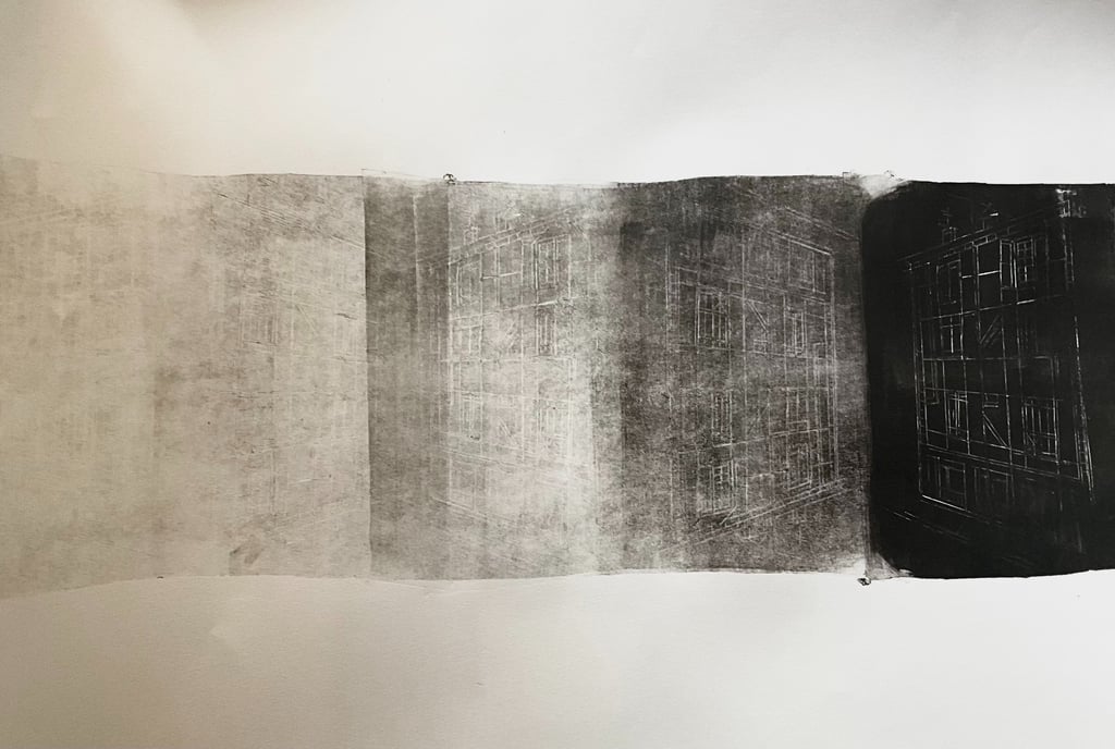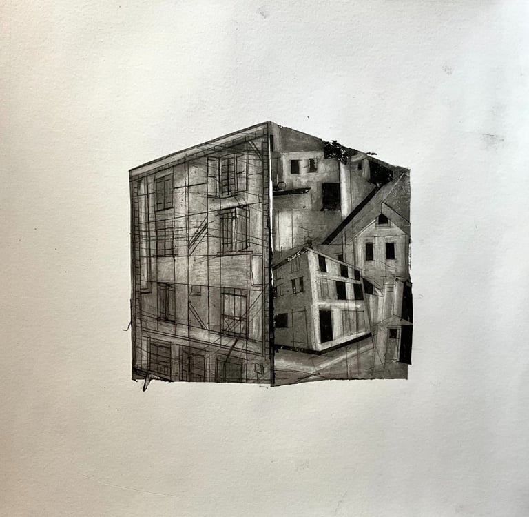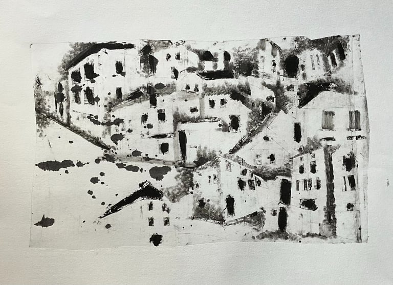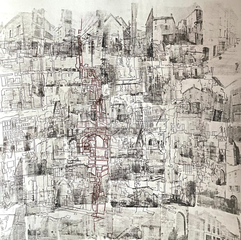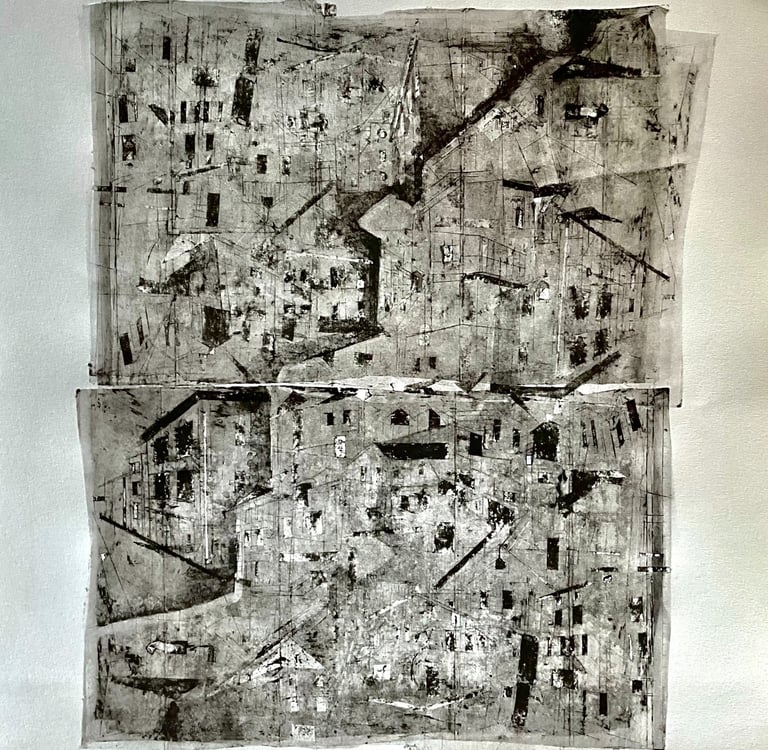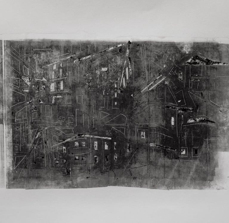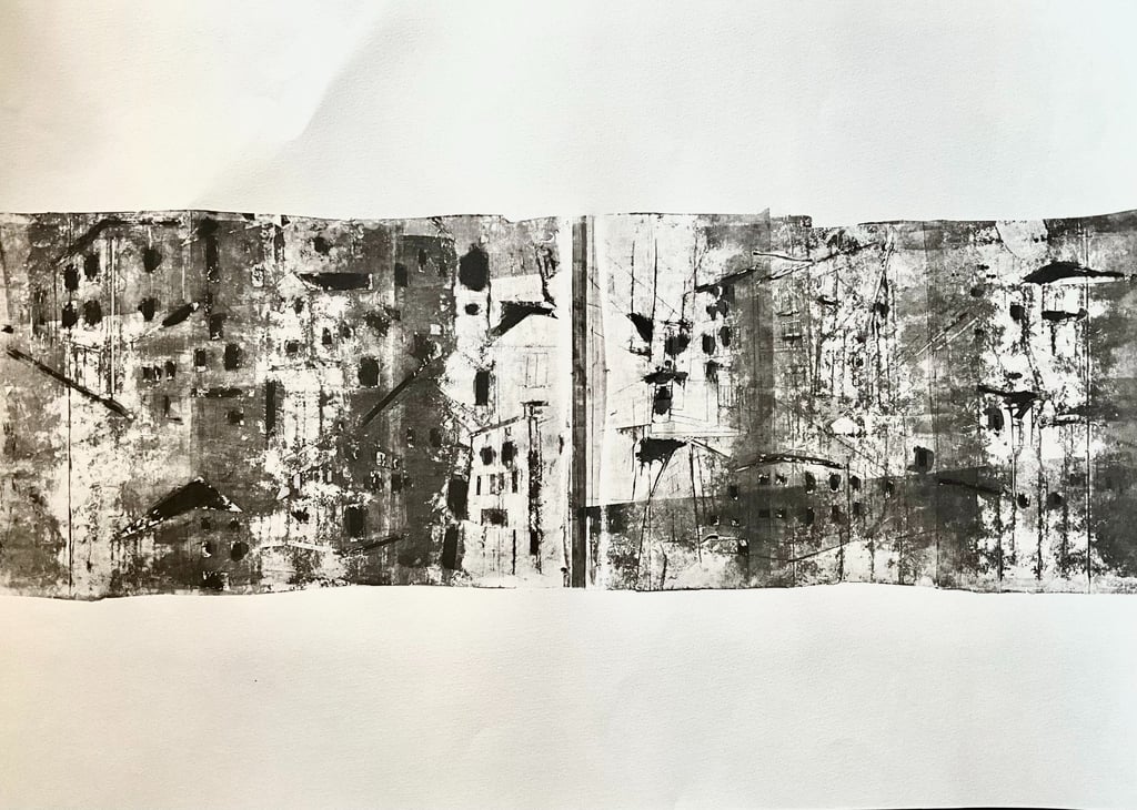 My process included drawing, photo transfer, and printmaking, deconstructing the townscape into basic geometric elements and creating a visual language through the interplay of lines and shapes inspired by its unique architectural features. In my printmaking experiments, I repurposed domestic objects, further examining the relationship between space and material.