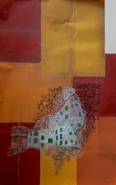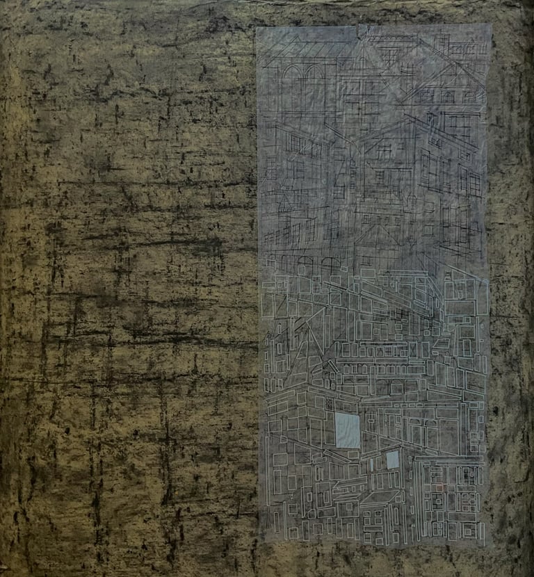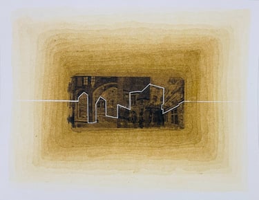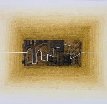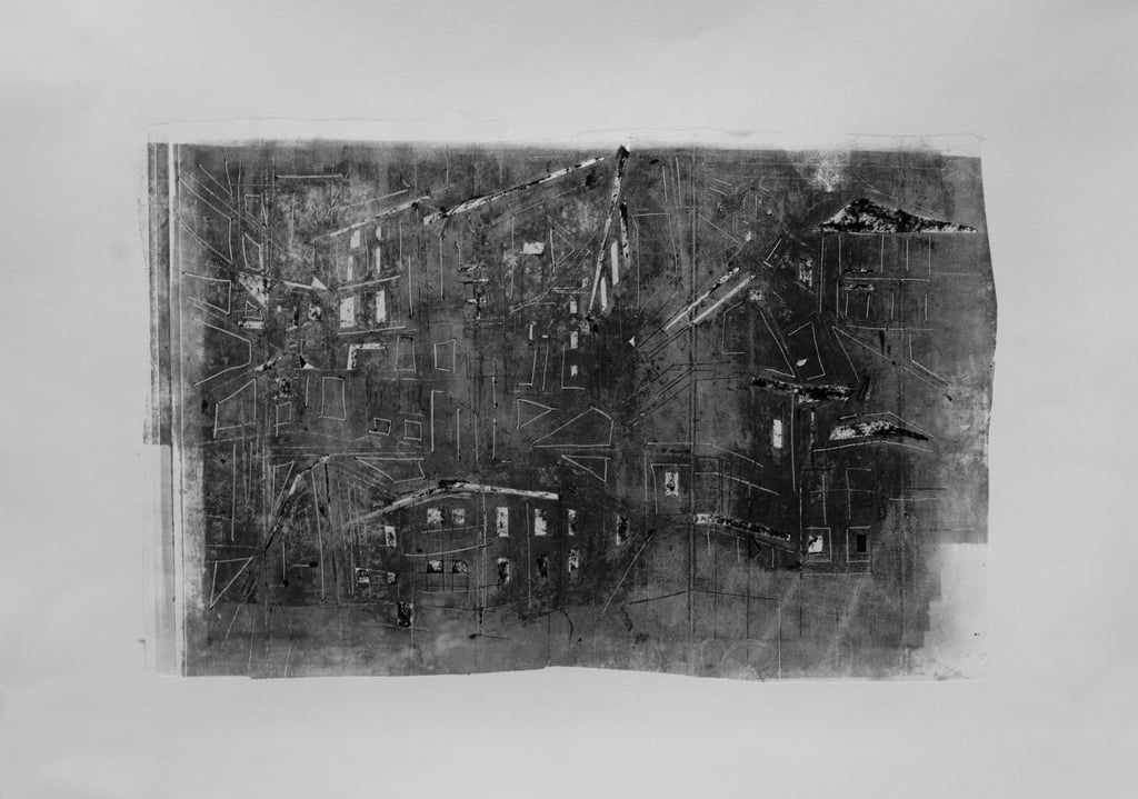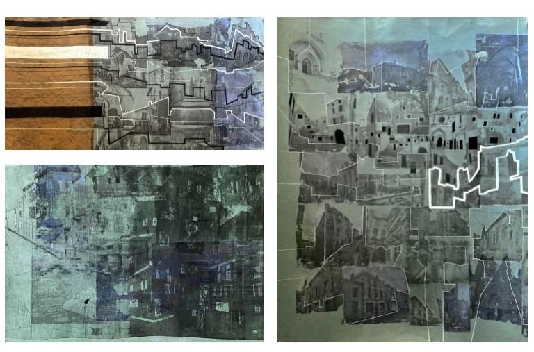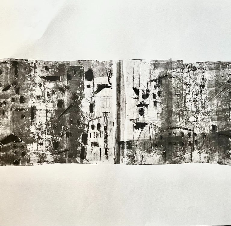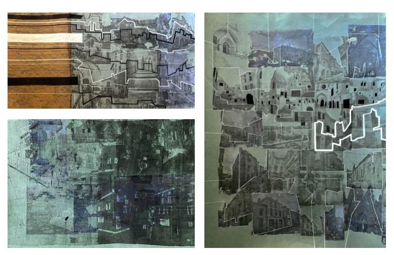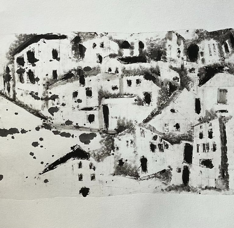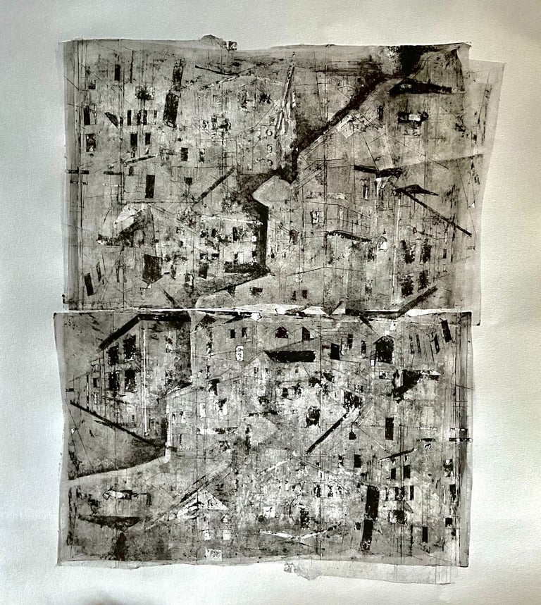 My process included drawing, photo transfer, and printmaking, deconstructing the townscape into basic geometric elements and creating a visual language through the interplay of lines and shapes inspired by its unique architectural features. In my printmaking experiments, I repurposed domestic objects, further examining the relationship between space and material.