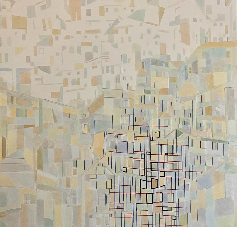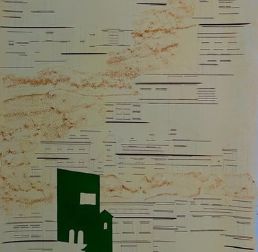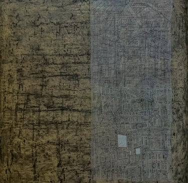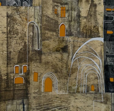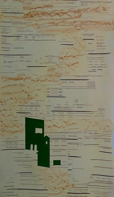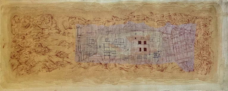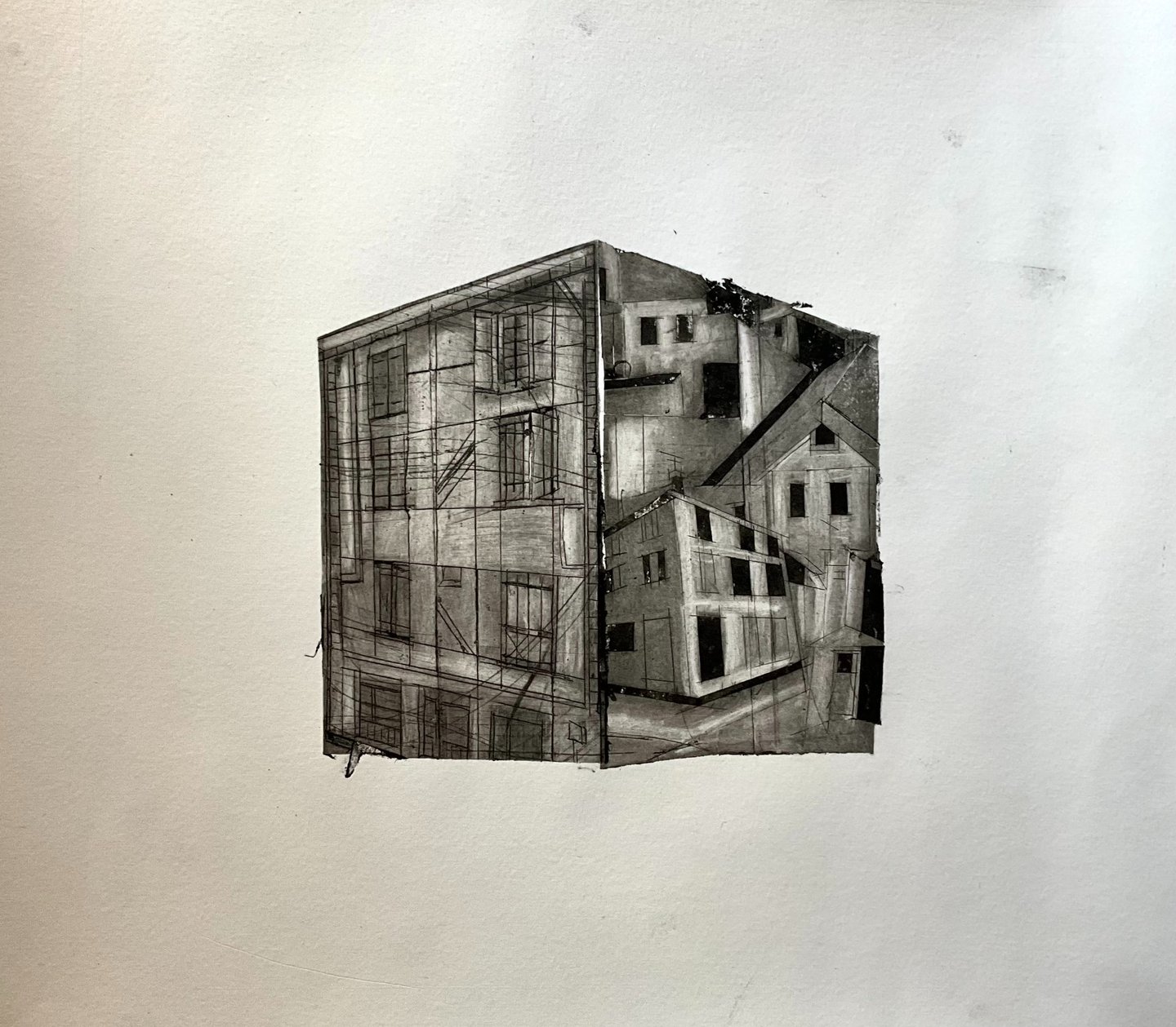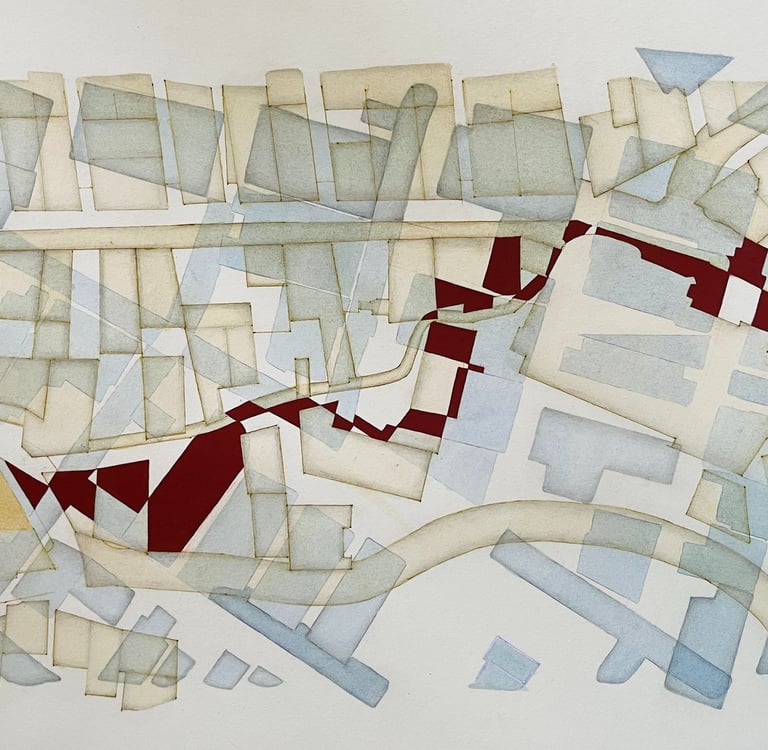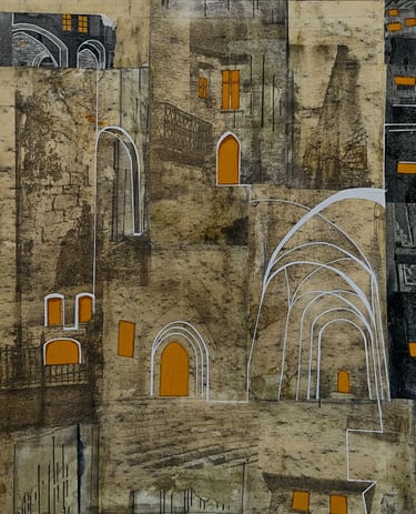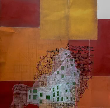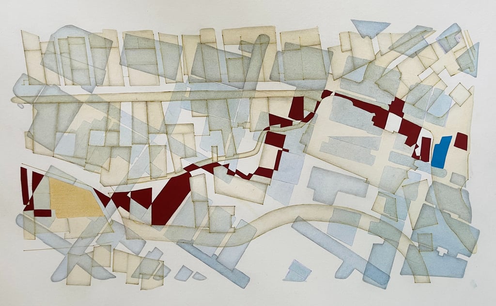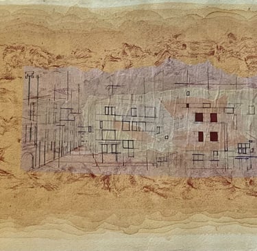 My process included drawing, photo transfer, and printmaking, deconstructing the townscape into basic geometric elements and creating a visual language through the interplay of lines and shapes inspired by its unique architectural features. In my printmaking experiments, I repurposed domestic objects, further examining the relationship between space and material.