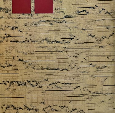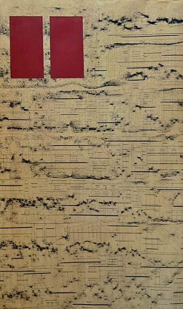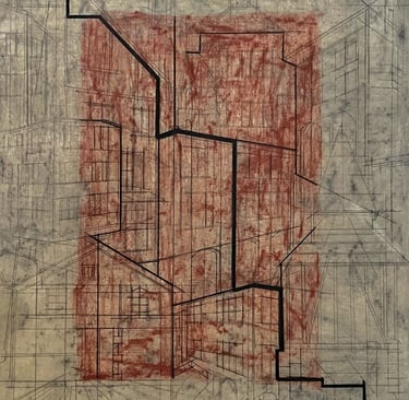 Code | 2023 | charcoal, graphite, ink, stone, pigment & red oxide pigment on paper | 24 x 16 inches