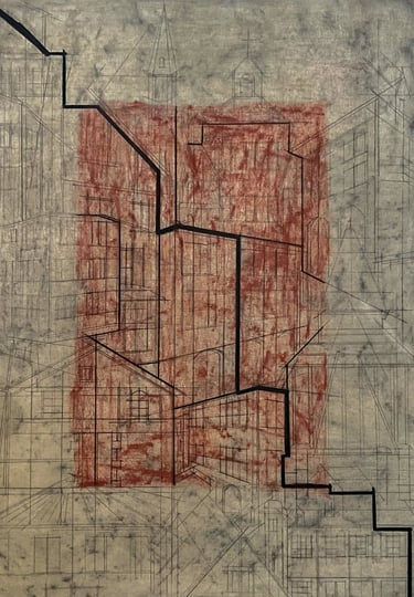 During the residency, my focus shifted from interior domestic spaces to the medieval architecture of the commune’s exteriors. I explored its geometry, textures, and cultural elements through observational drawings and pigments extracted from local stones. The vibrant, government-regulated windows, contrasting with the stone buildings, became a key focus, adding layers of narrative to the visual landscape.