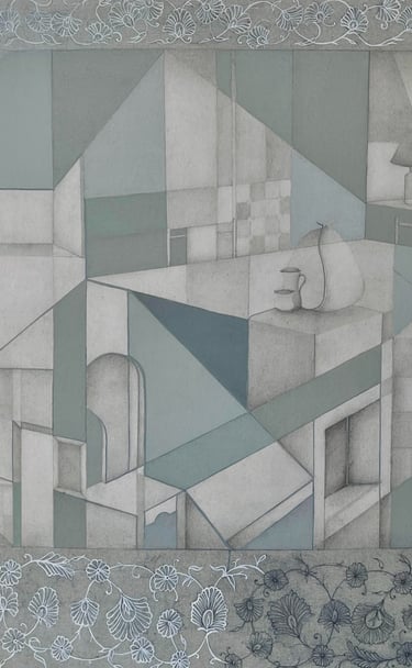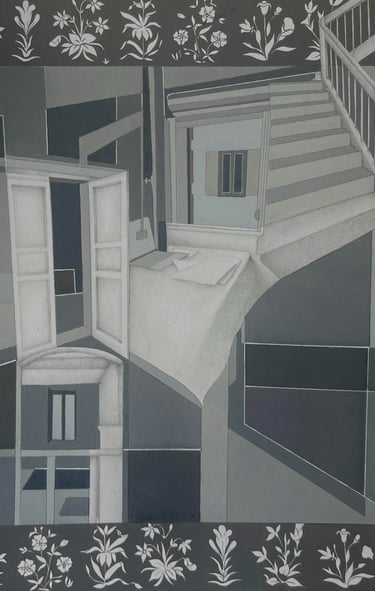 In this body of work, I explored how spaces can feel distant or alienating. Using cold & muted tones, I focused on environments that suggest isolation & emotional distance. I incorporated traditional miniature patterns, but intentionally interrupted them, reflecting moments of disconnection, where familiarity begins to fall apart. Through the contrast between careful detail & fracture, the work looks at how our sense of belonging to a place can weaken, leaving spaces that feel unresolved & in-between.